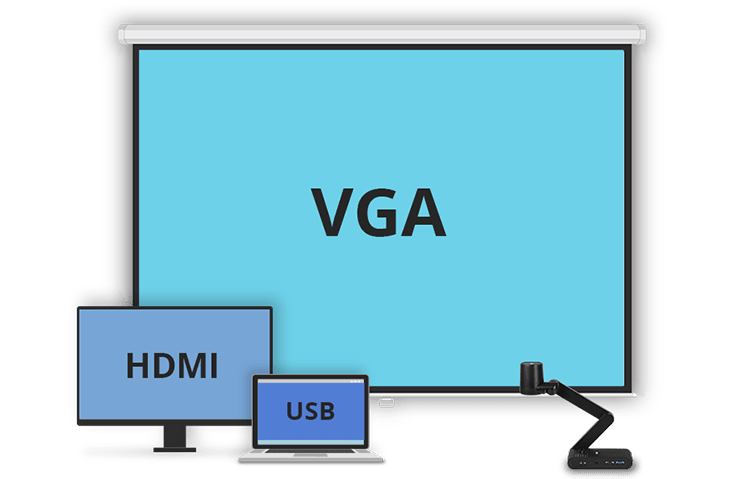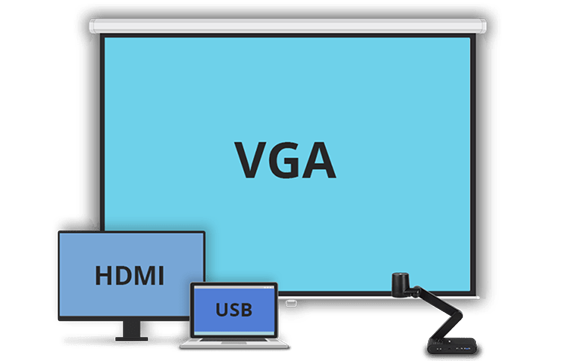 Dank der HMI-, VGA- und USB-Buchsen lässt sich die M90UHD mit jedem Monitor oder Computer verbinden, damit alle die vertrauten Geräte nutzen können.