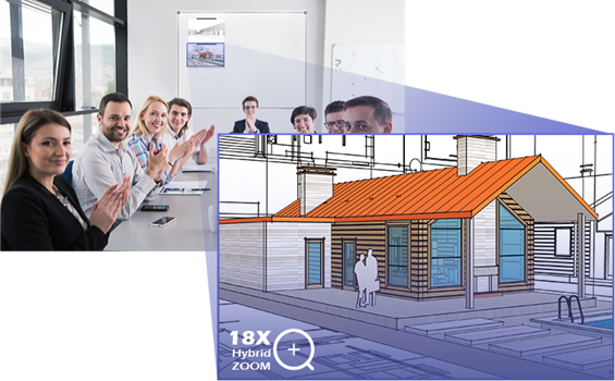 Optimieren Sie Ihr Videomeeting mit der VB35 und der 4K-Dual-Objekttivtechnologie. Mit dem vergrößerten 113°-Sichtfeld und dem 18-fachen Hybridzoom erfasst die VB360 kristallklare Bilder von Vordergrund und Hintergrund im Meetingraum bis zu 7 m Tiefe.