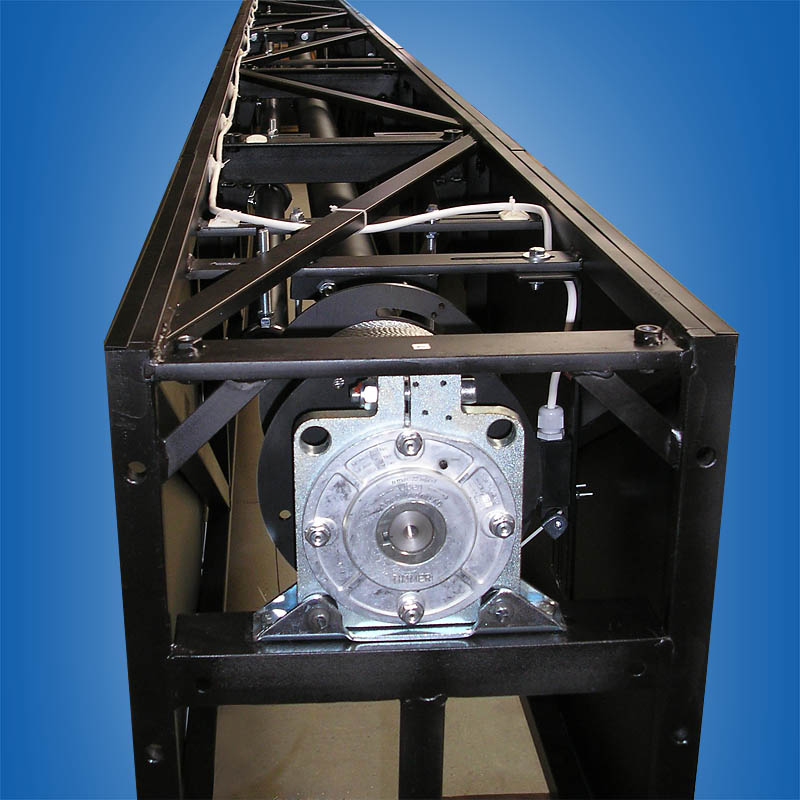 - Die Wickelwelle wird durch zwei seitliche Stahlseile rechts und links auf-und abgefahren