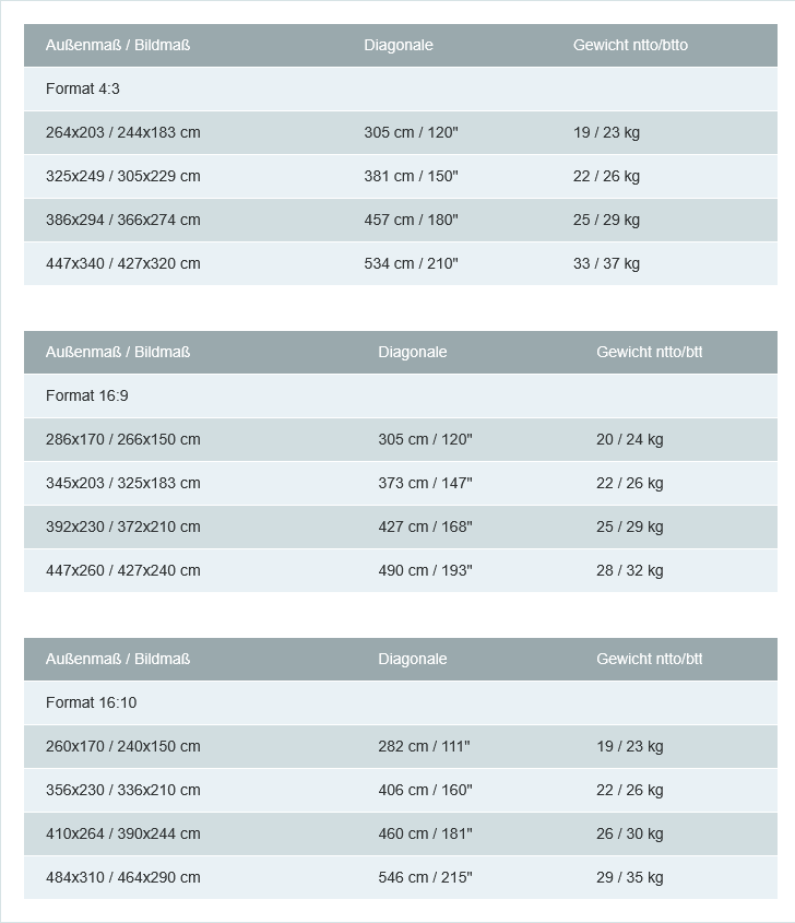 - Im Lieferumfang sind robuste Tragetaschen für Rahmen und Bildwandfläche enthalten