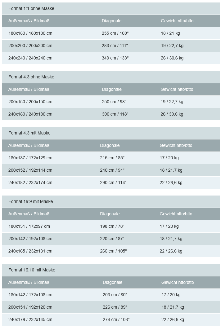 - Möglichkeit der Herstellung von Nicht-Standard-Größen, Farben der Gehäuse und verschiedenen Typen von Projektionsflächen nach Kundenwunsch