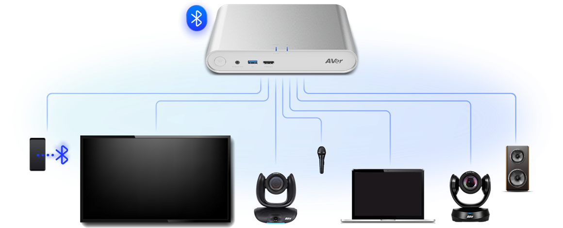 Erhebendes Konferenzerlebnis mit dem AVer FONE700, dem perfekten Decken-Speakerphone-System. Spitzentechnologie erlaubt dem FONE700 die nahtlose Integration in Ihre vielen Audio-Video-Produkte, mit Klang und Bild in höchster Qualität für optimale Konferenzen. Es beinhaltet auch den Anschluss von bis zu zwei Kameras, einem Display, externem Lautsprecher und Bluetooth-Geräten für einen wirklich einheitlichen AV-Hub für die Bedürfnisse Ihrer Konferenz.