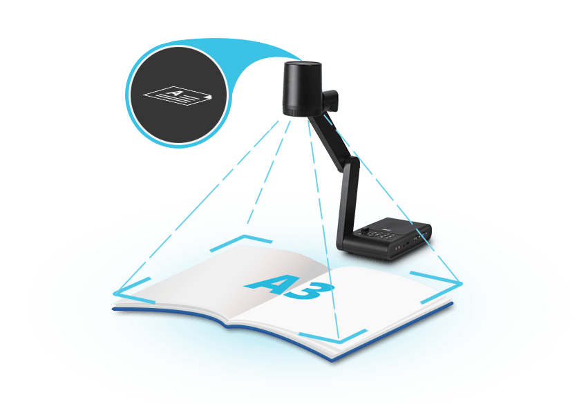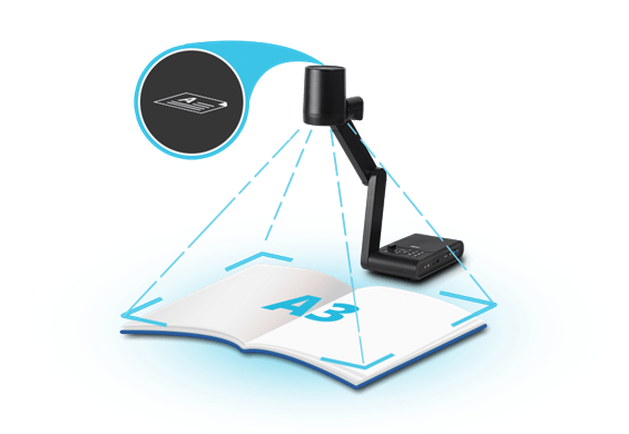 Ein größerer A3-Aufnahmebereich erfasst Objekte in der Größe der Modelle. Mit dem Positionsanzeiger der Kamera lassen sich alle Unterrichtsmaterialien stets akkurat darstellen.