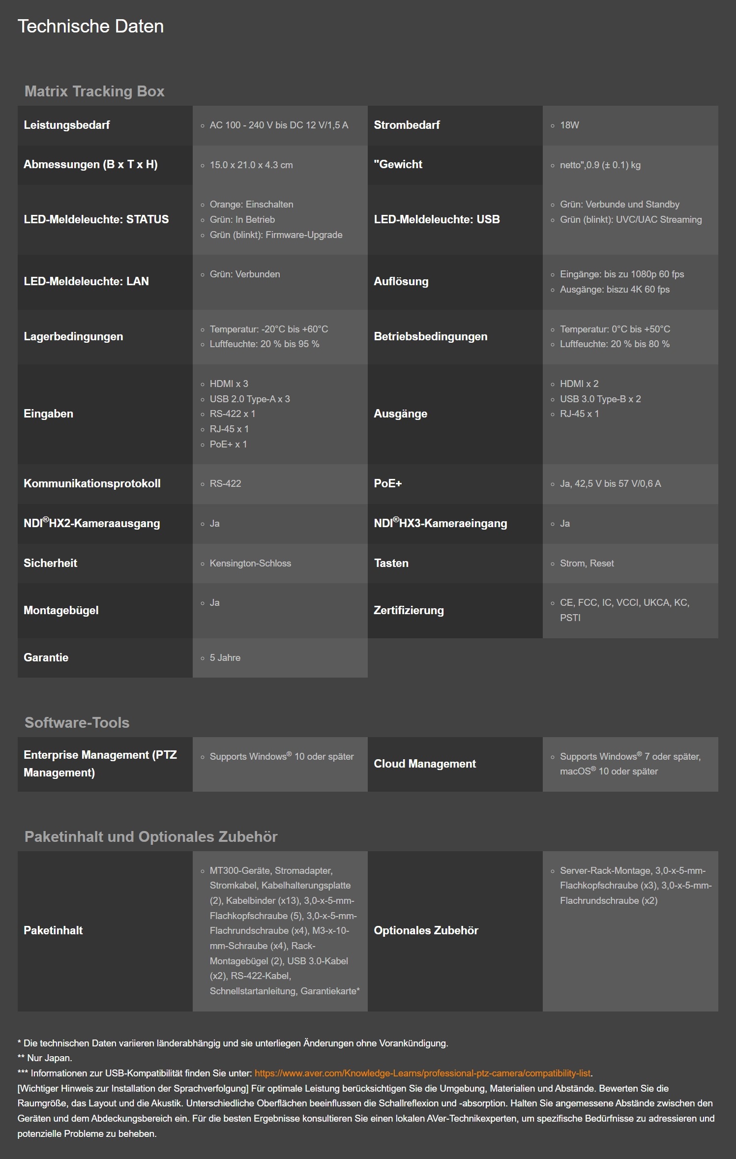 Mit der MT300 Matrix Tracking Box bringen Sie das audiovisuelle Erlebnis auf ein neues Level. Mit dem hochmodernen Multimediagerät von AVer werden Management und Steuerung mehrerer Quellen auf einer vereinheitlichen Plattform zum Kinderspiel. Von Meetings und Schulungssitzungen bis hin zu Klassenzimmern – die MT300 passt sich jeder Größenanforderung perfekt an. Mit der MT300 gelingt das Mix-and-Match von Audio, Video und Computergeräten für ein ultimatives Multimedia-Erlebnis im Handumdrehen. Die Zukunft des A/V-Managements ist schon hier.