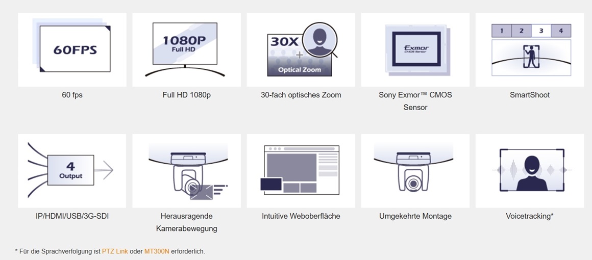 AVers PTZ231 ist eine fortschrittliche PTZ-Kamera mit vollständiger Kontrolle über Ihren Streaming-Inhalt. Professionelle Streamen mit Full-HD 1080p-Ausgängen bei 60ftps, mit 30-fach optischem Zoom und hochmodernem SmartShoot-Feature. Dank der optimalen Livestream-Performance werden Sie Ihr Publikum mit der PTZ231 garantiert verblüffen.