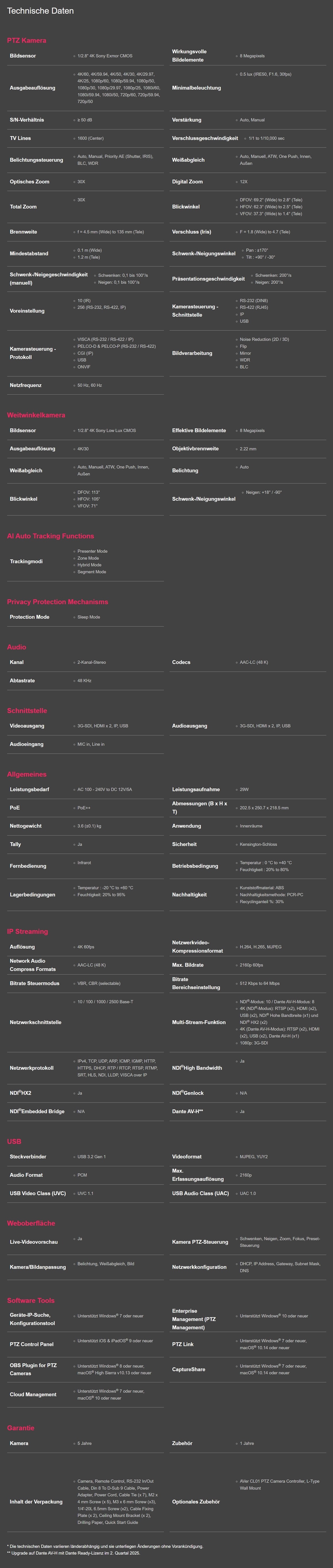 Die Zukunft der Streaming-Exzellenz mit AVER TR535, mit KI Auto-Tracking für unzählige Anwendungen. PTZ-Kamera TR535 mit 30-fach Stellar-Zoom und weitreichendem Weitwinkel. Das Weitwinkelobjektiv erfasst die gesamte Szene, die 4K PTZ-Kamera zoomt für Nahaufnahmen hoch und gewährleistet die vollständige Erfassung. Mit vier fortschrittlichen KI-gesteuerten Trackingmodi liefert die TR535 einzigartige Präzision beim Senden, Streamen und Aufzeichnen.