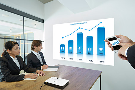 Diese Modell ist standardmäßig mit WLAN ausgestattet, damit Sie von mehr Freiheit und Flexibilität profitieren können. Mit NFC verläuft die Anbindung des Projektors an ein Android-Smartphone oder -Tablet kinderleicht, während Sie mit der iProjection-App kabellos Projektionen durchführen können. Dank MHL-Unterstützung (Mobile High-Definition) können qualitativ hochwertige Video- und Audioinhalte via Kabel von Mobilgeräten an den Projektor übertragen und diese gleichzeitig aufgeladen werden.