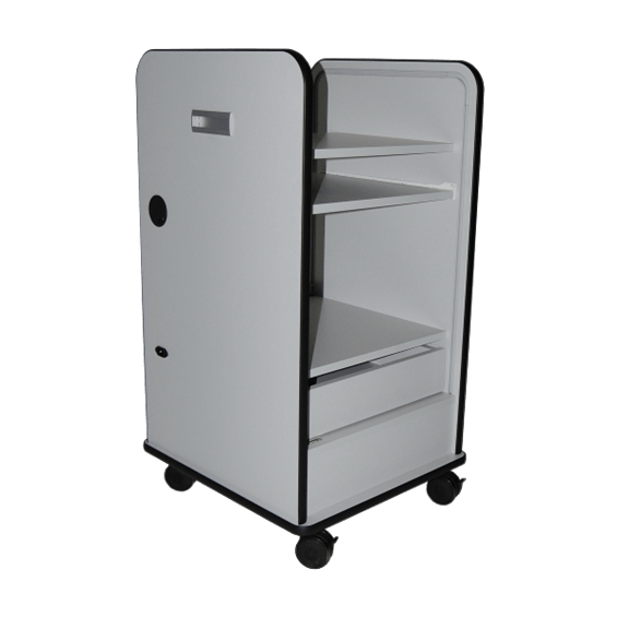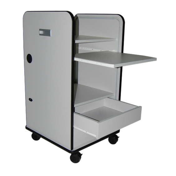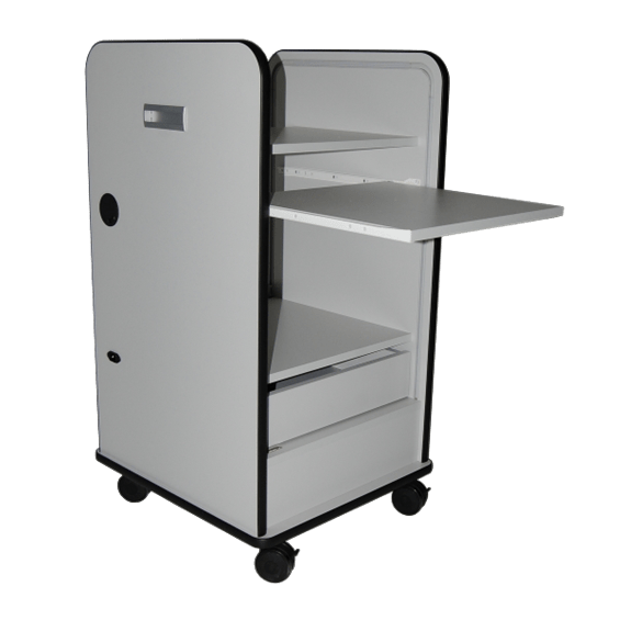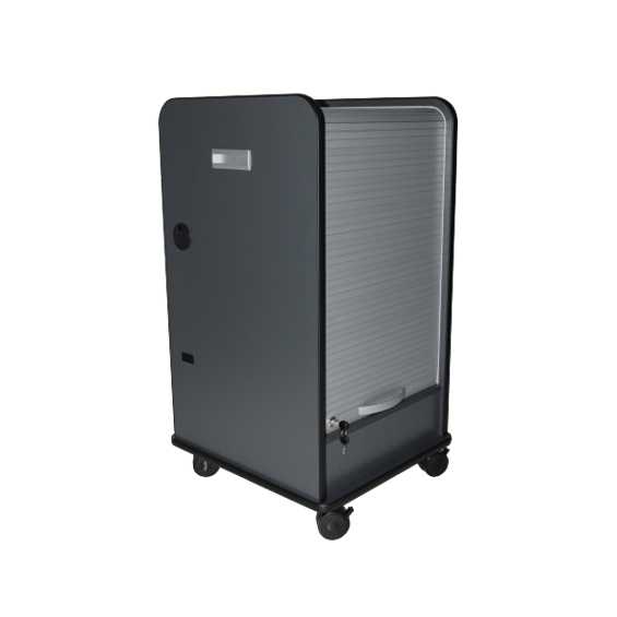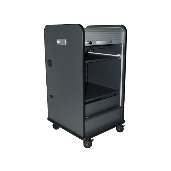 silberfarbiges Rollo (abschließbar) - integrierte Schublade - seitliche Griffmulden - Kabelauslaß (1x Seitenwand) -